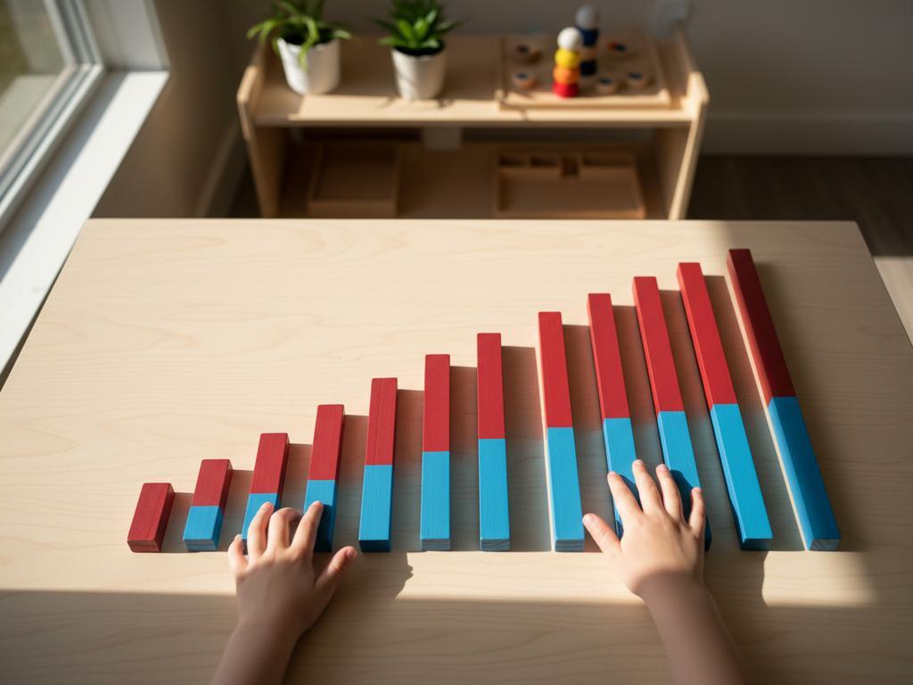 Montessori-Materialien sind so konzipiert, dass *jede Zahl sichtbar und spürbar wird*. Ein Beispiel: Ein roter Stab ist doppelt so lang wie der blaue – das ist die Zwei zur Eins, ohne Zahlensymbol. Diese multisensorische Herangehensweise spricht verschiedene Lerntypen an und führt zu einer *tieferen, nachhaltigeren Verankerung mathematischer Konzepte*.