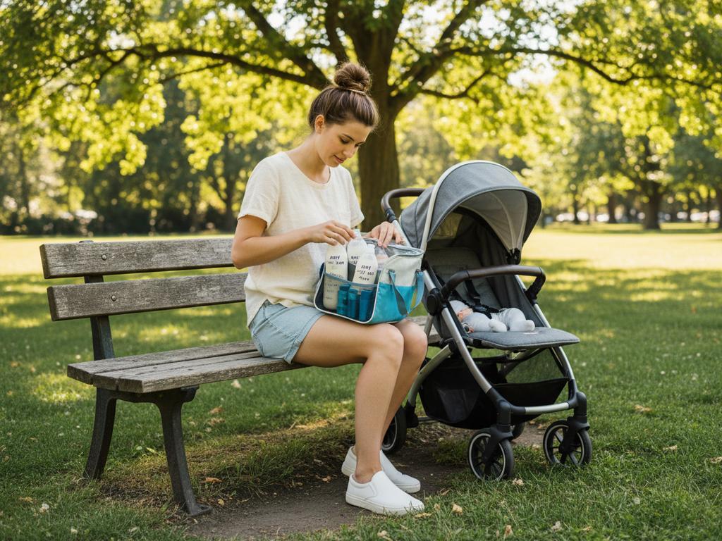 Fotorealistisches Bild einer modernen Mutter, die im Park eine Kühltasche mit Muttermilch vorbereitet. Es zeigt praktische Aufbewahrungsmöglichkeiten für Muttermilch auf einem Ausflug, eingebettet in einen natürlichen Outdoor-Kontext.